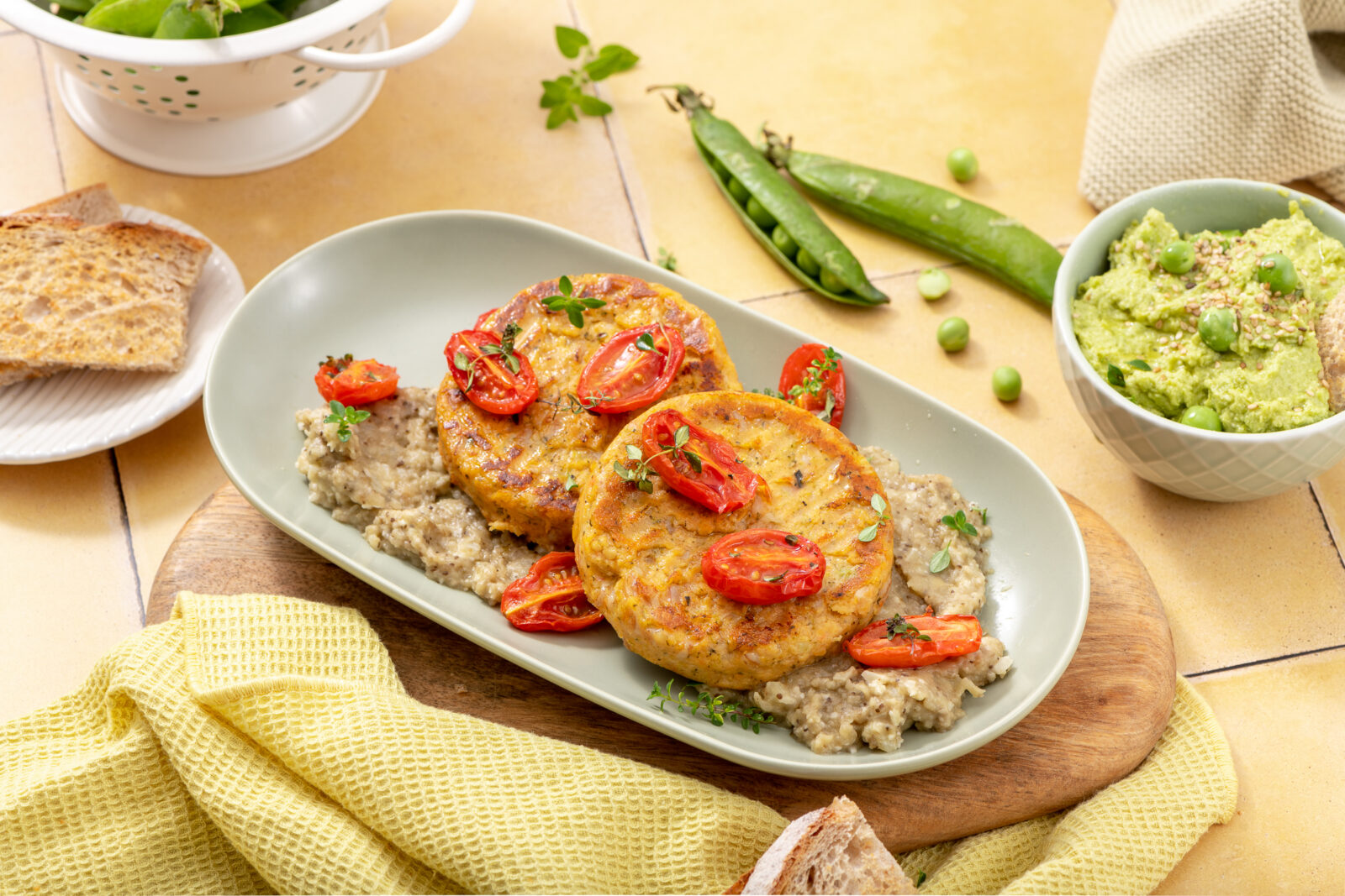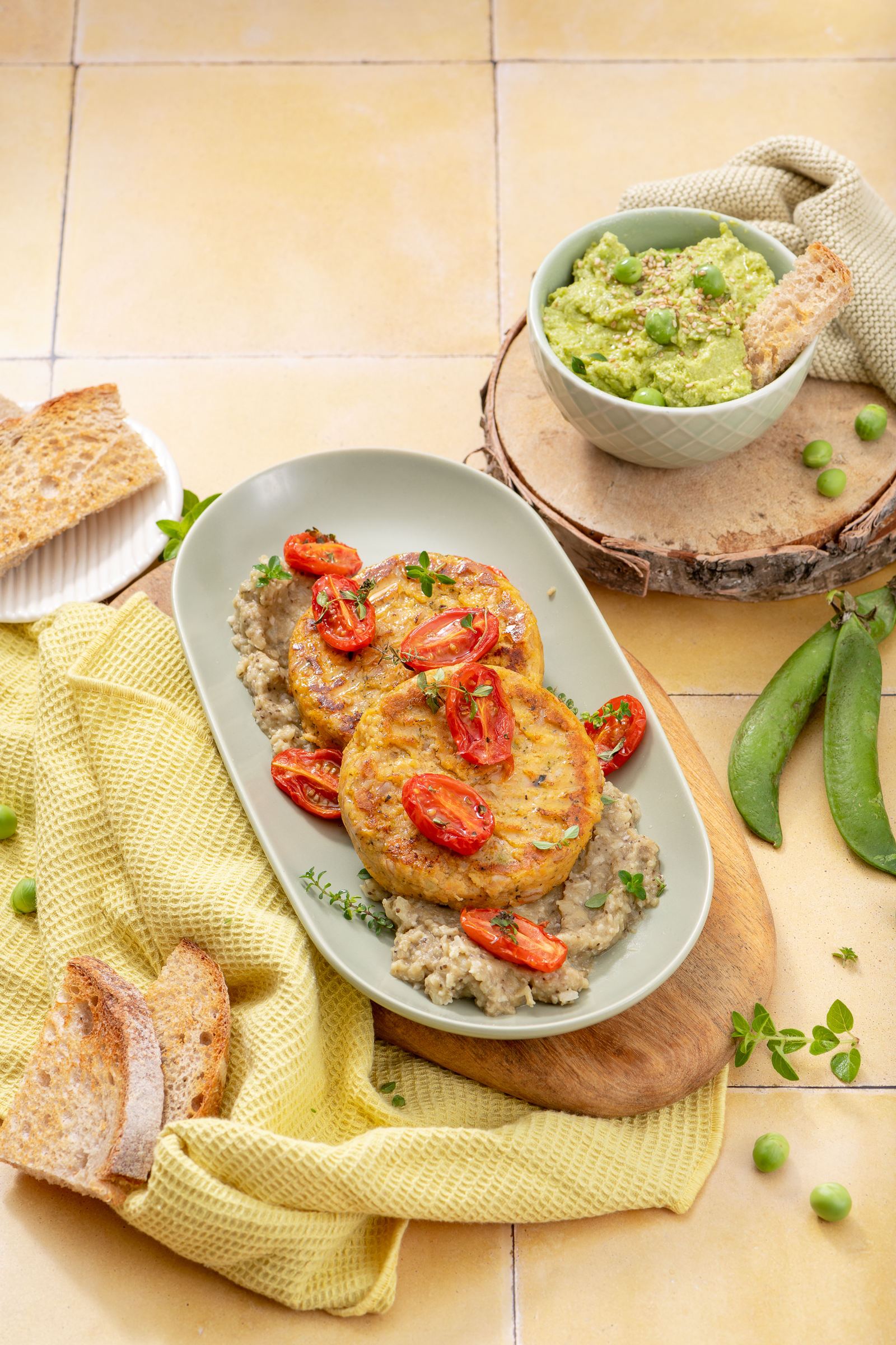 Crocchette di tofu, farro, datterini con crema di melanzane e pomodorini confit servite con humus di piselli