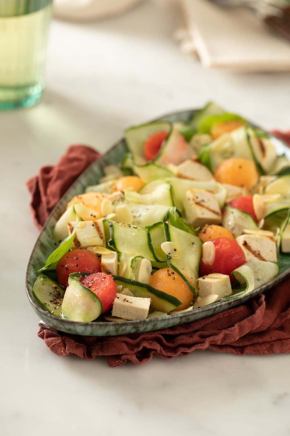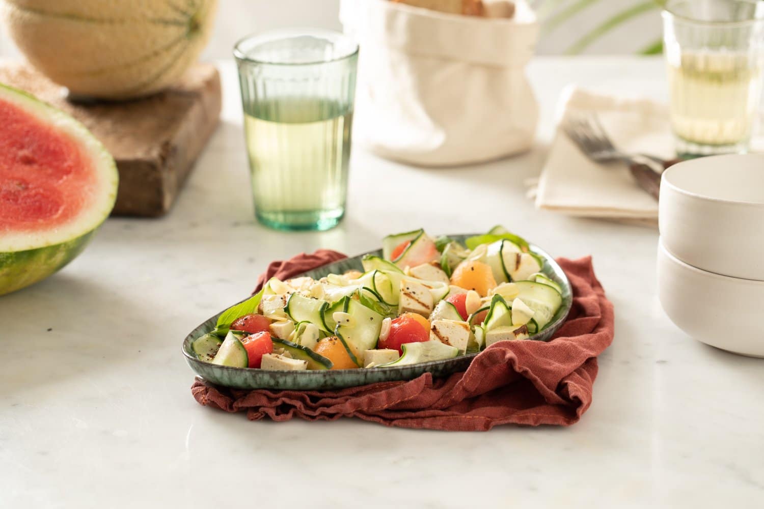 Insalata di tofu aromatico con cetrioli, anguria, melone e mandorle