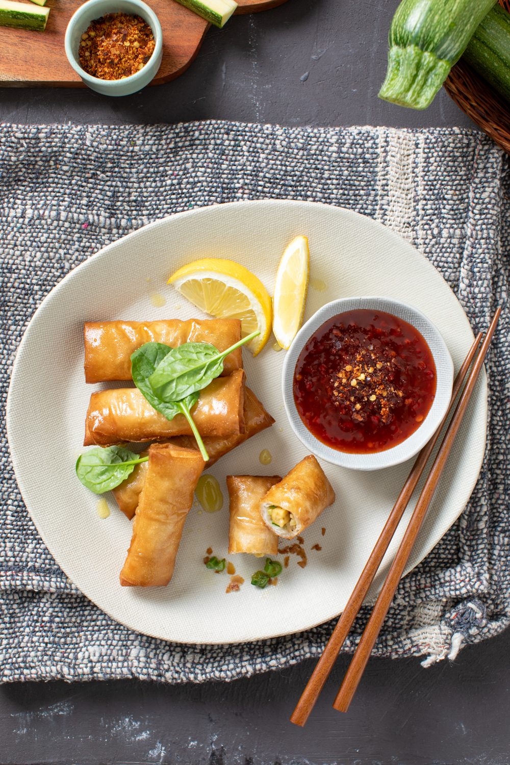 Rolls di pasta fillo con tempeh, zucchine e cipollotti, salsa agrodolce e insalata di rucola, limone e nocciole