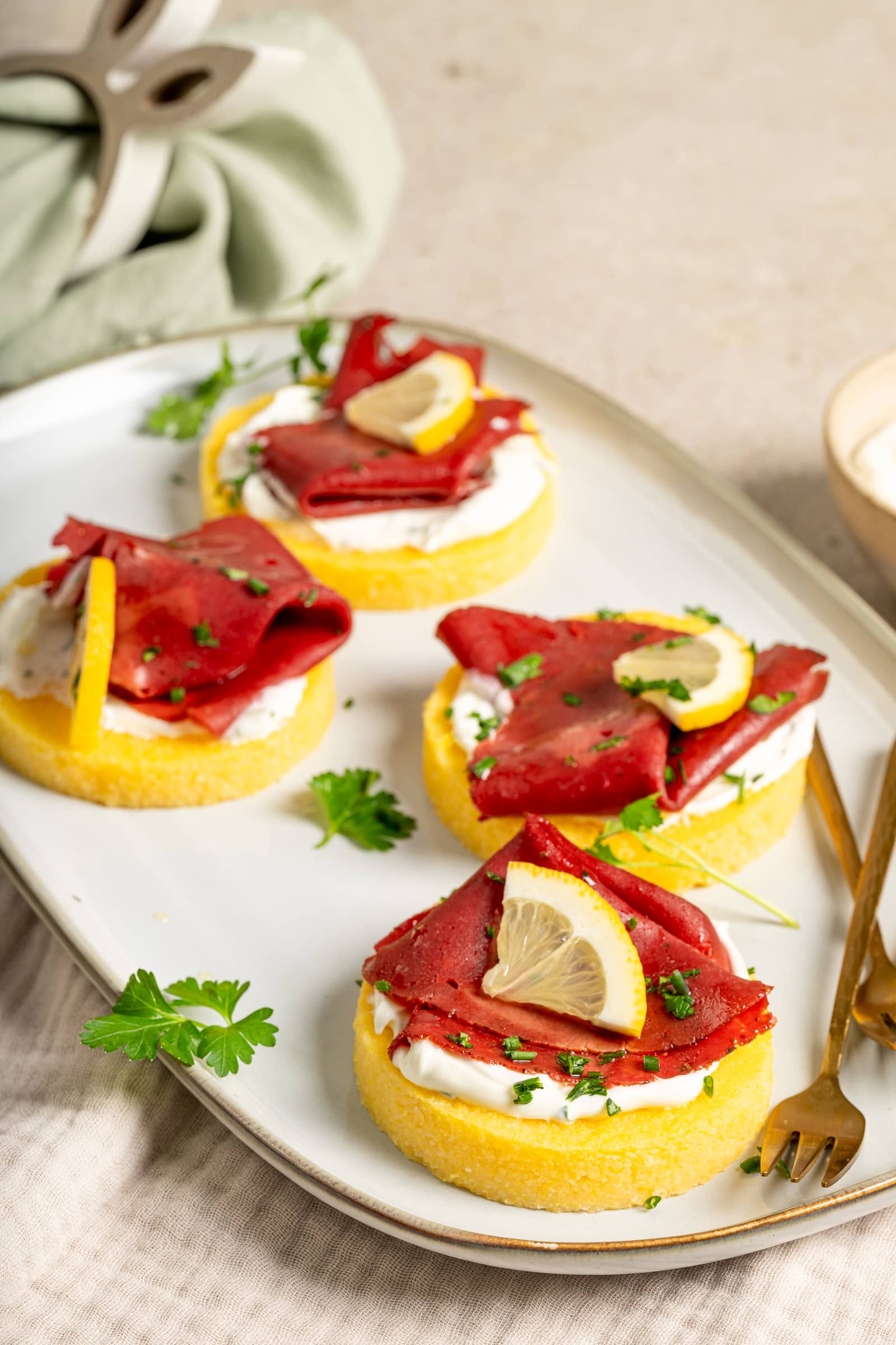 Tartine di polenta con formaggio spalmabile e bresaola, al profumo di erbe aromatiche