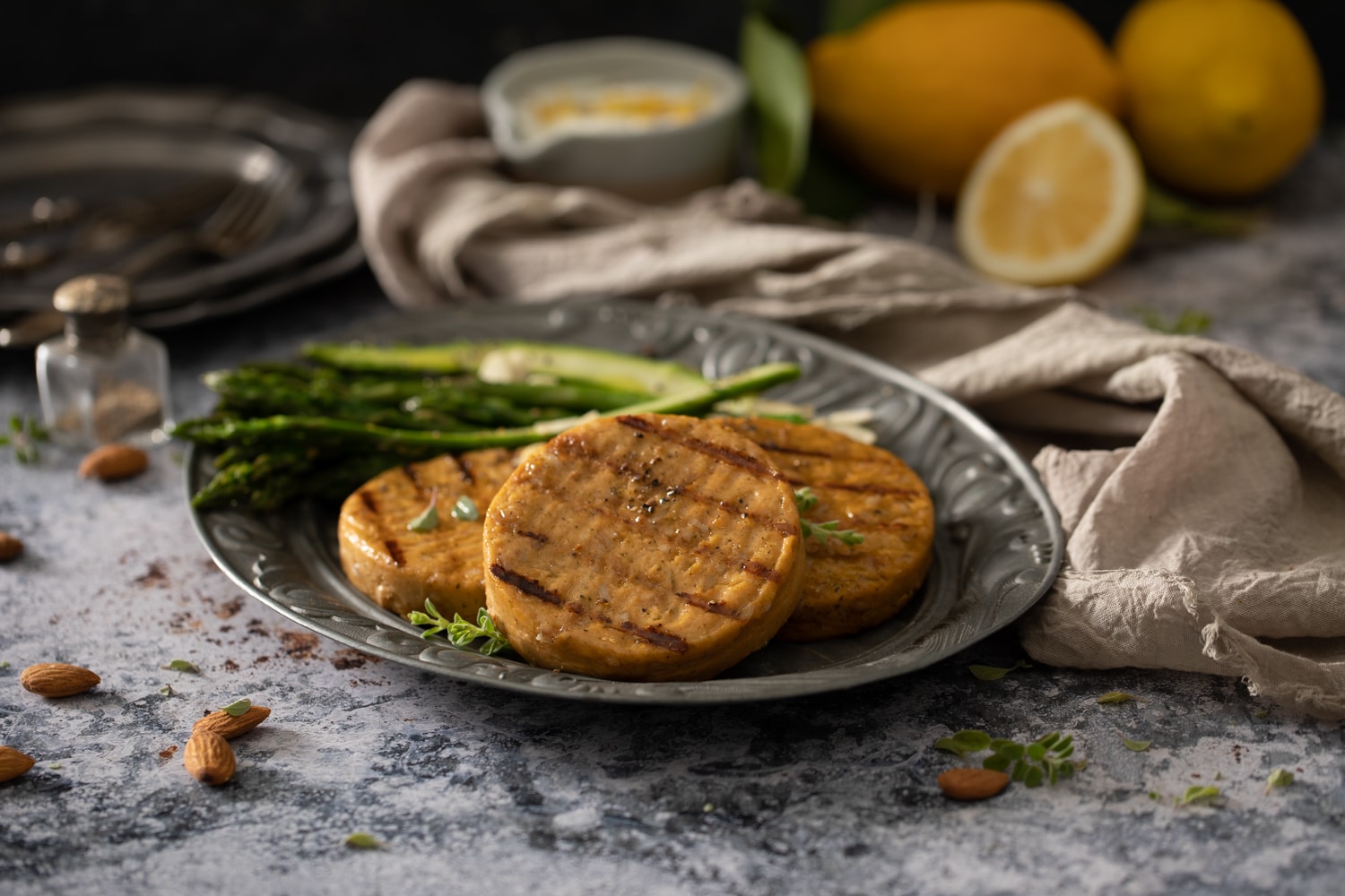 Crocchette tofu, farro, datterini alla piastra, accompagnate da asparagi alle mandorle e salsa yogurt al limone