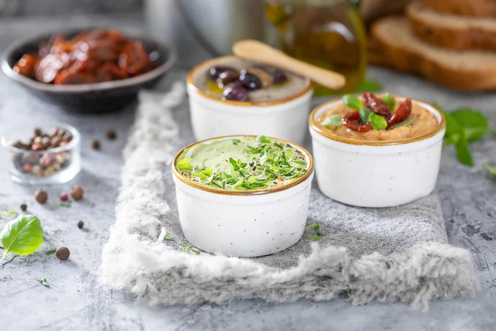 Patè di tofu: ai pomodori secchi, alle olive taggiasche, al peperoncino e cipollotto, alle erbe aromatiche